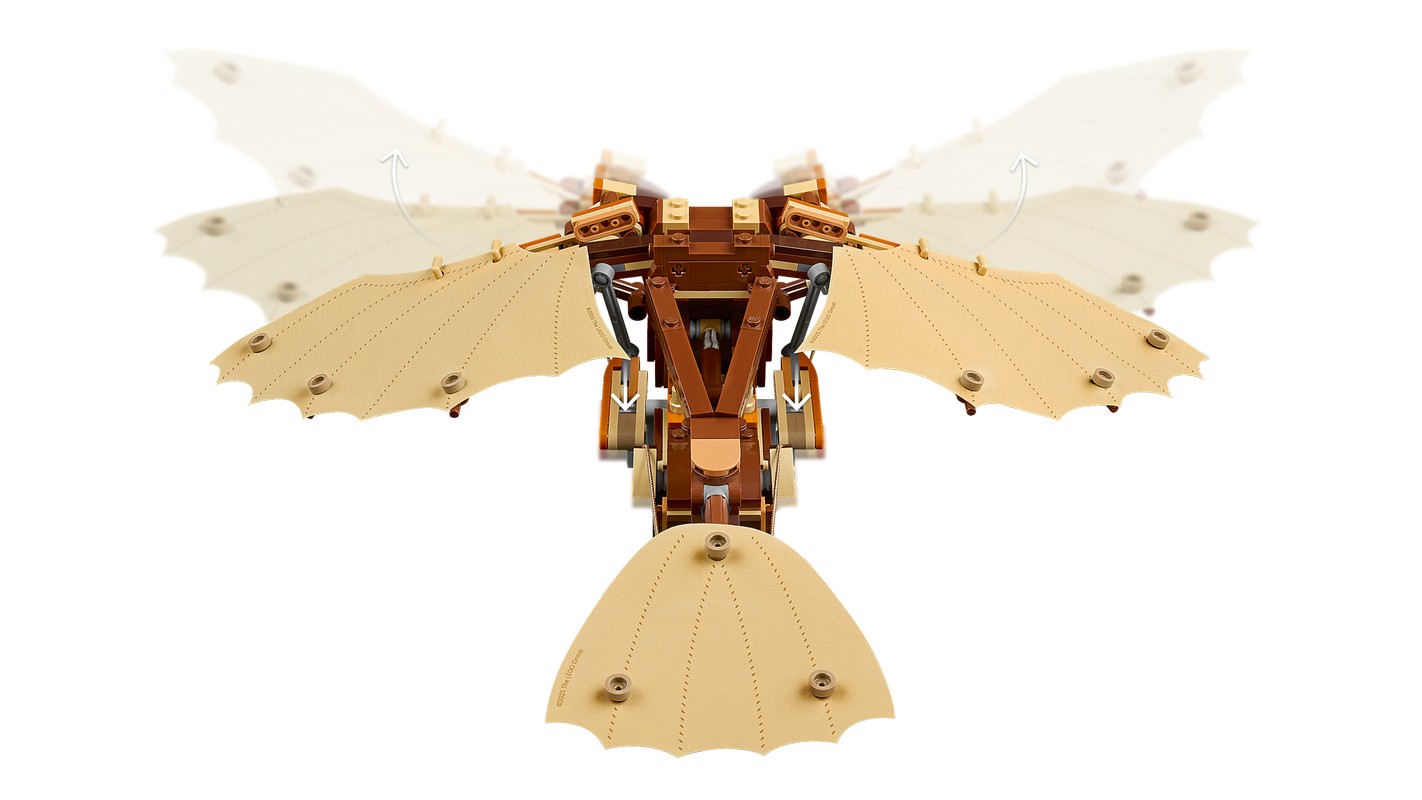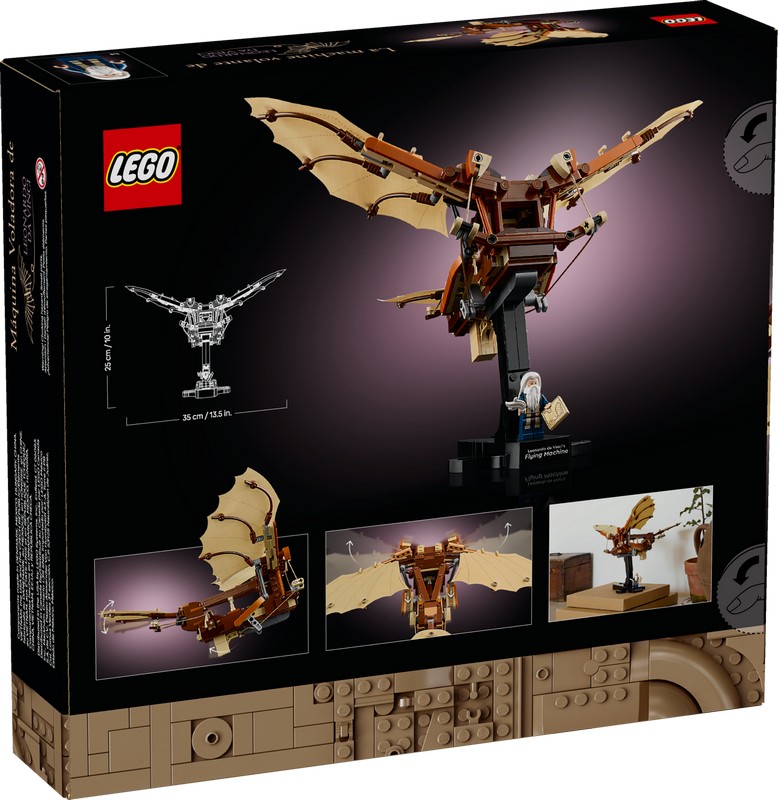 - В коробке есть все необходимое для создания летательного аппарата. подробная интерпретация фантастического орнитоптера да Винчи от LEGO®, а также подставка для демонстрации и минифигурка Леонардо да Винчи с пером и эскизом крыльев, активируемых триггером. – Воссоздайте летательный аппарат Леонардо да Винчи с его складывающимися текстильными крыльями и хвостом, приводимыми в движение сложным видимым механизмом из веревок, шарниров и блоков.