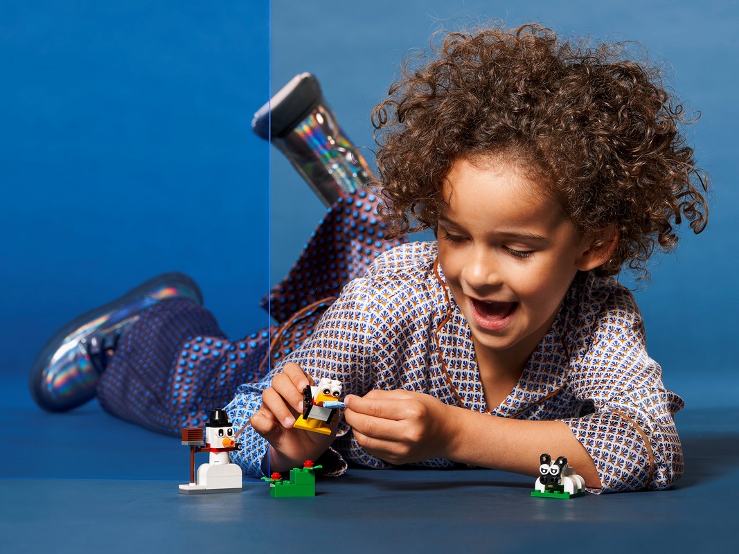 - Набор состоит из 60 деталей LEGO. Дети могут собрать снеговика с метлой, овечку с цветочным лугом и чайку с рыбой, а также всё, на что только хватит воображения.
