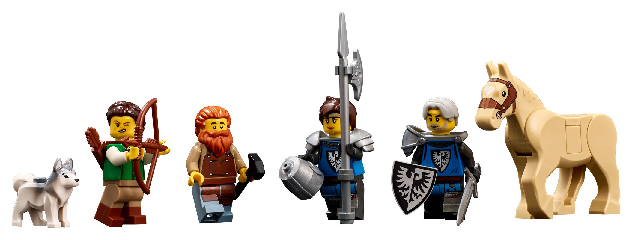 - В набор входят 4 минифигурки: кузнец, лучник и 2 рыцаря Черного Сокола с 4 мечами, 3 щитами и алебардой. Фигурка лошади со сборной тележкой может принимать различные позы, а еще в наборе есть фигурки собаки и древесной лягушки.