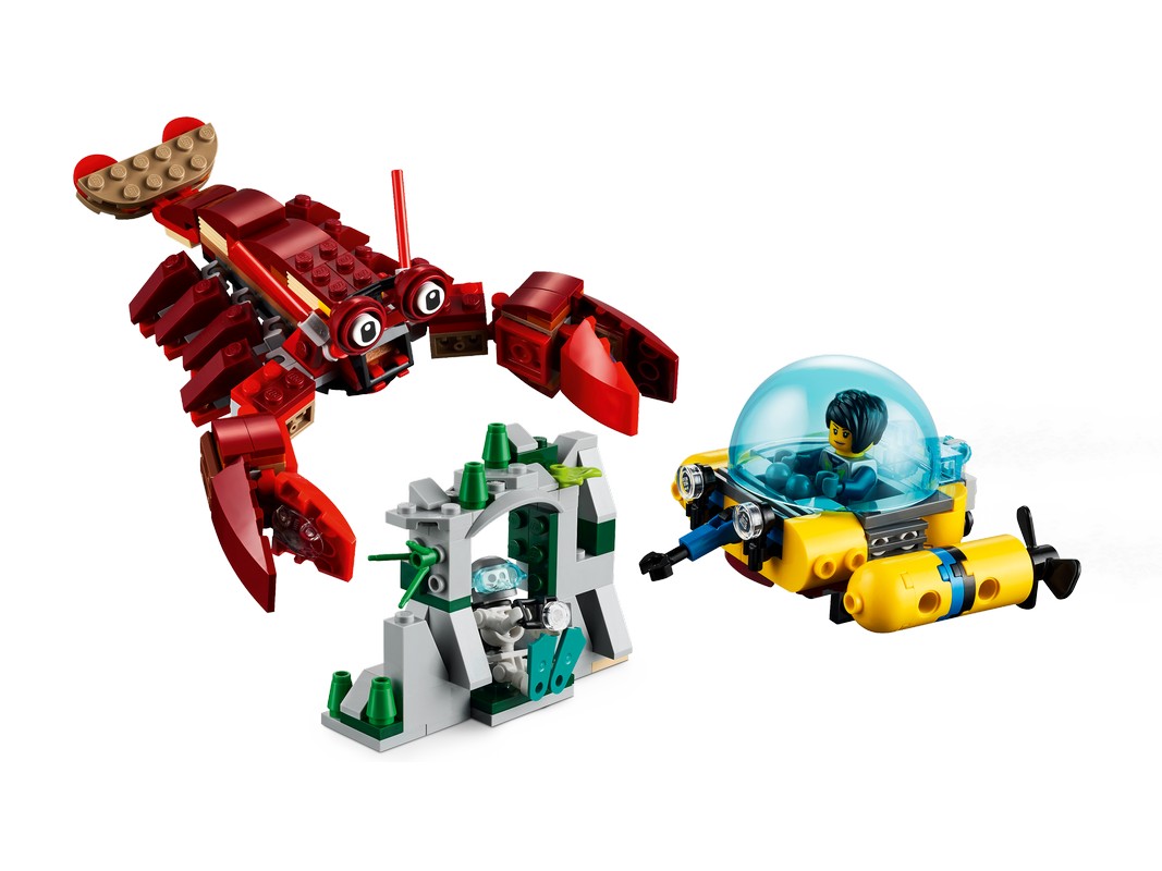 Дети могут наслаждаться 3 различными способами сборки и игры с этим набором LEGO Creator 3в1. Они могут построить подводную лодку и игрушки с осьминогами, а затем перестроить их в меньшую подводную лодку и гигантский игровой набор с лобстерами. Они могут создать сцену с гигантским скатом-мантой, дайвером и коралловым рифом с небольшой пещерой или использовать свое воображение и превратить те же кирпичи во что-то другое.