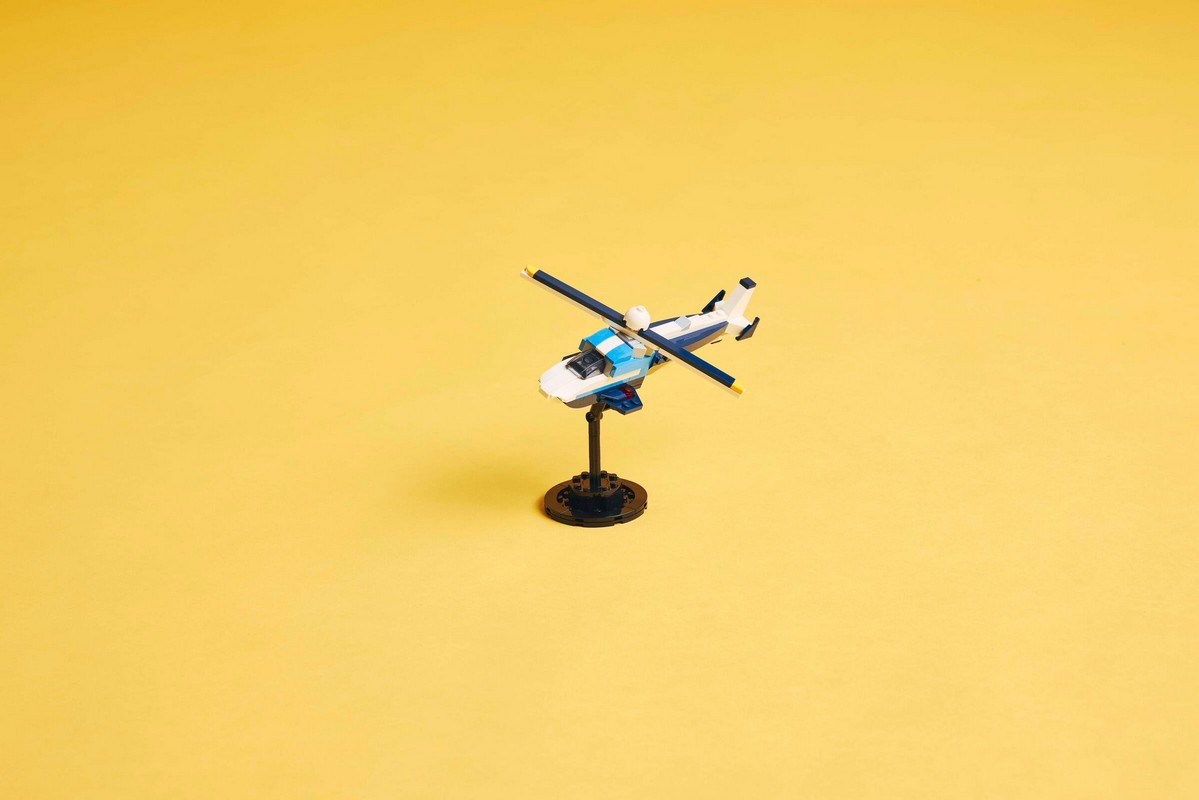 Дети могут выбрать для сборки 3 различных удивительных транспортных средства: игрушечный самолет с вращающимся пропеллером и движущимися колесами; игрушечный реактивный самолет с движущимися колесами; и модель вертолета с вращающейся лопастью несущего винта. Каждая модель может быть выставлена на стенде из кирпичиков, и этот набор станет отличным подарком для детей, которые любят разыгрывать увлекательные истории.