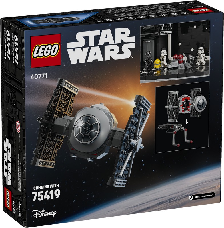 - 2 машины Star Wars™ – истребитель TIE со съемной передней частью для доступа в кабину минифигурки LEGO® и сервисная тележка со съемными элементами оборудования и местом для минифигурки LEGO