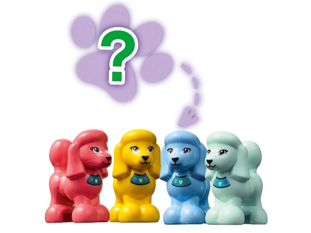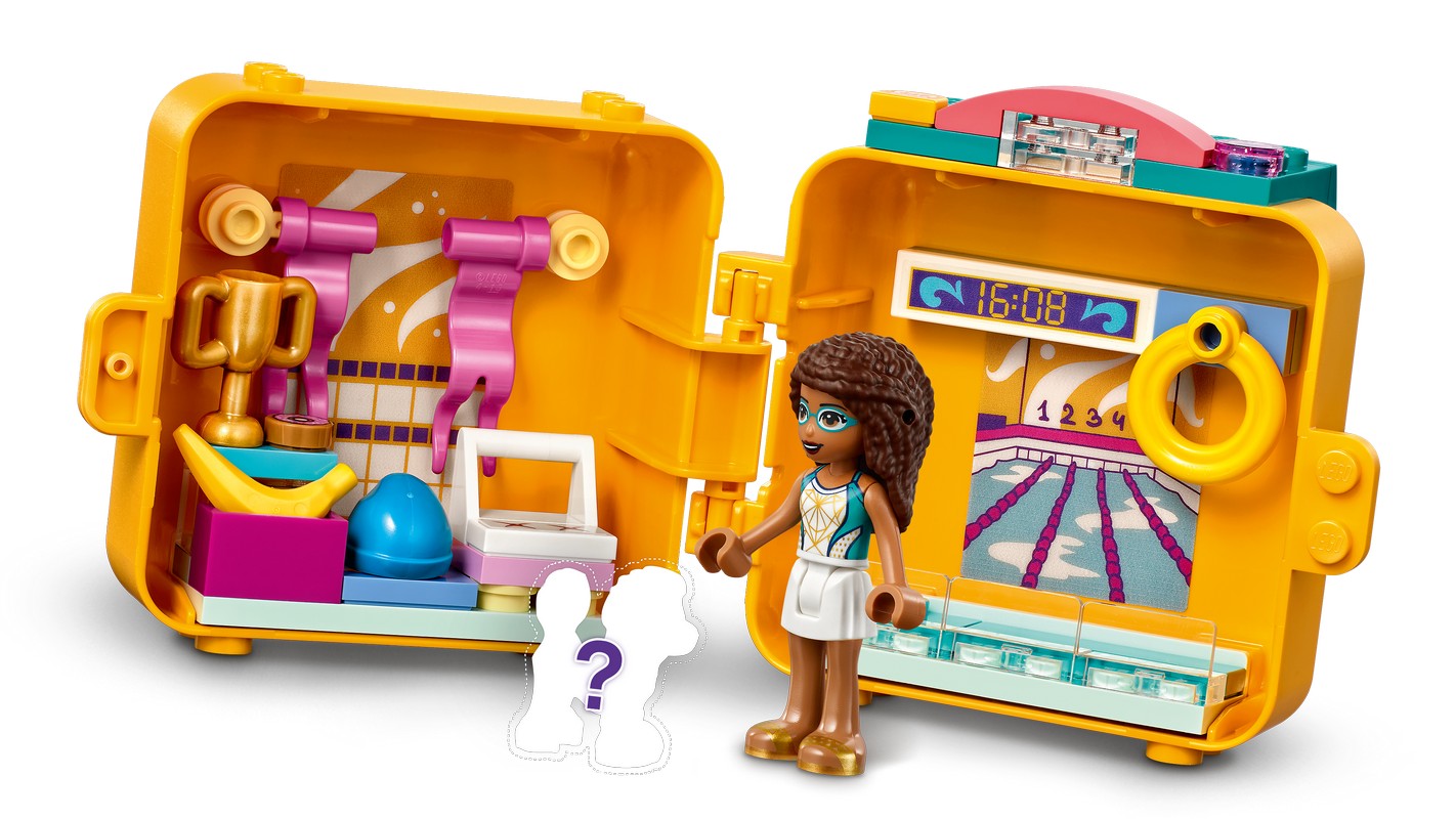 - В кьюбе есть мини-куколка Андреа LEGO Friends Andrea, игрушечный пудель одного из четырех различных цветов, маленький бассейн и стул для сборки, а также множество творческих элементов, помогающих разжечь воображение.