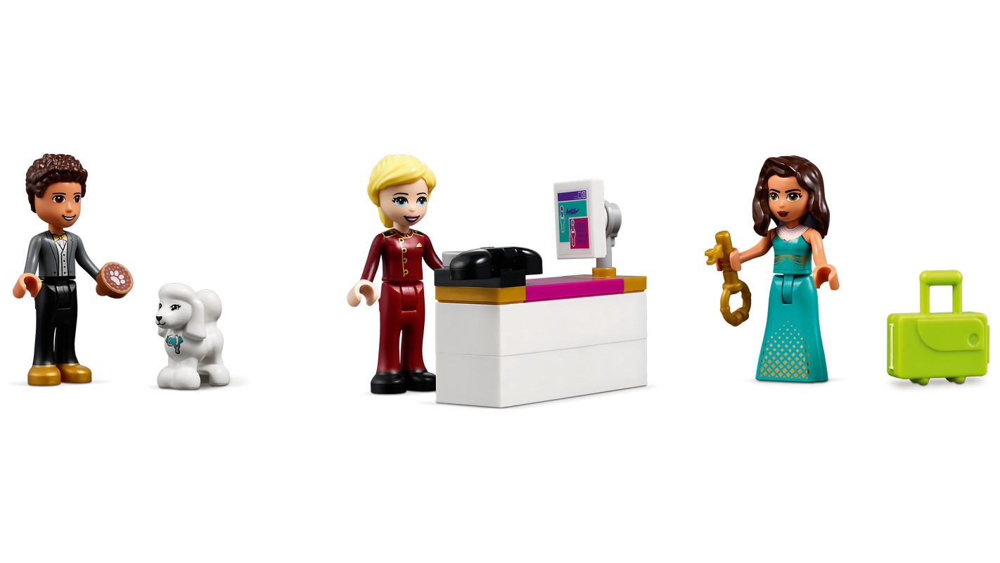 - Как и все наборы серии LEGO Friends, эта модель из 1308 элементов полна реалистичных аксессуаров, которые помогают разжечь воображение для по-настоящему творческой игры. Тут есть даже багажная тележка и ключи, которые подходят к дверям номеров!