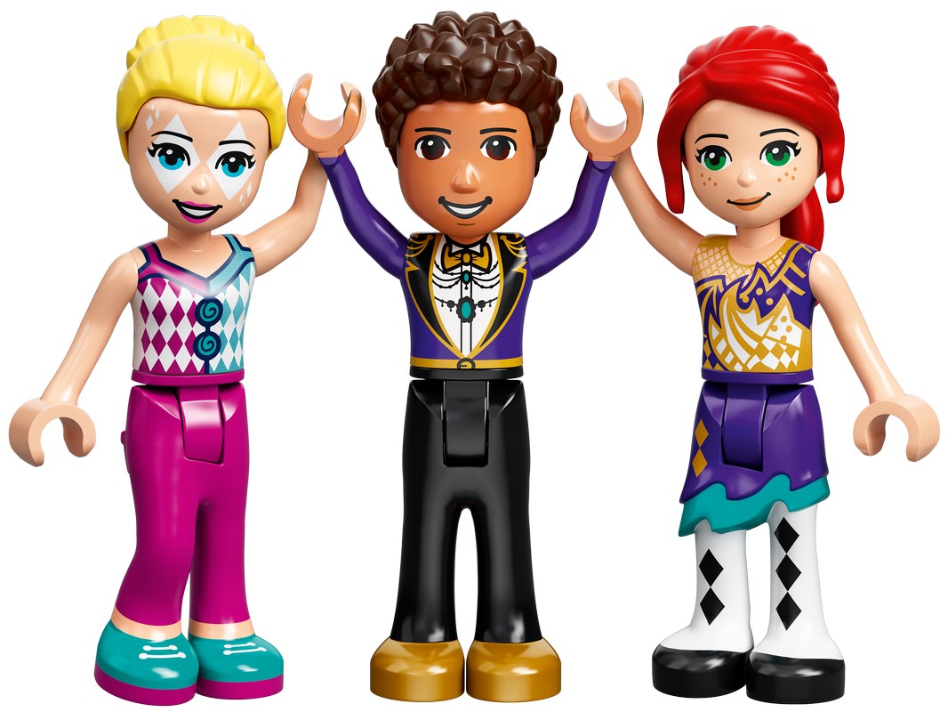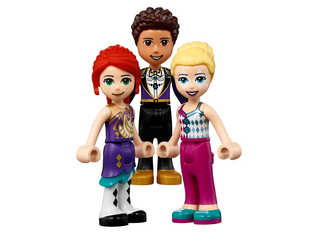 - В этот карнавальный набор входят 3 мини-куколки LEGO Friends, одетые в ярмарочные одежды и с раскрашенными лицами, а также творческий карнавальный набор, включающий в себя булавы для жонглирования, леденец, цилиндр и карту ярмарки.
