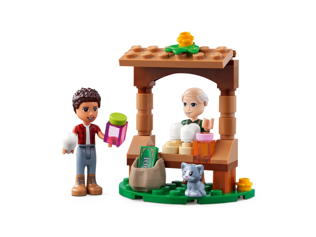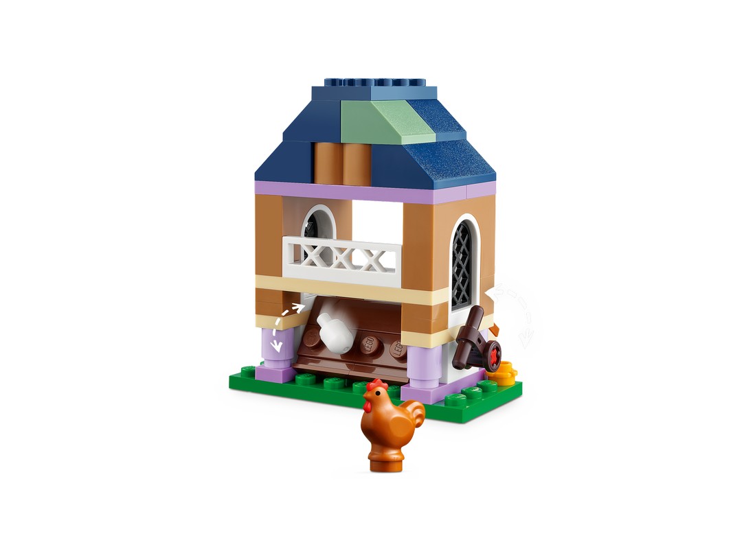 Фермерский дом имеет съемные элементы так что дети могут "починить" крышу своими инструментами. Мини-куклы собирают овощи с помощью трактора и прицепа, а также ухаживают за сельскохозяйственными животными theLEGO®. На кухне дети, которые любят готовить здоровую пищу, могут притвориться, что готовят домашние блюда или варенье для продажи на прилавке.