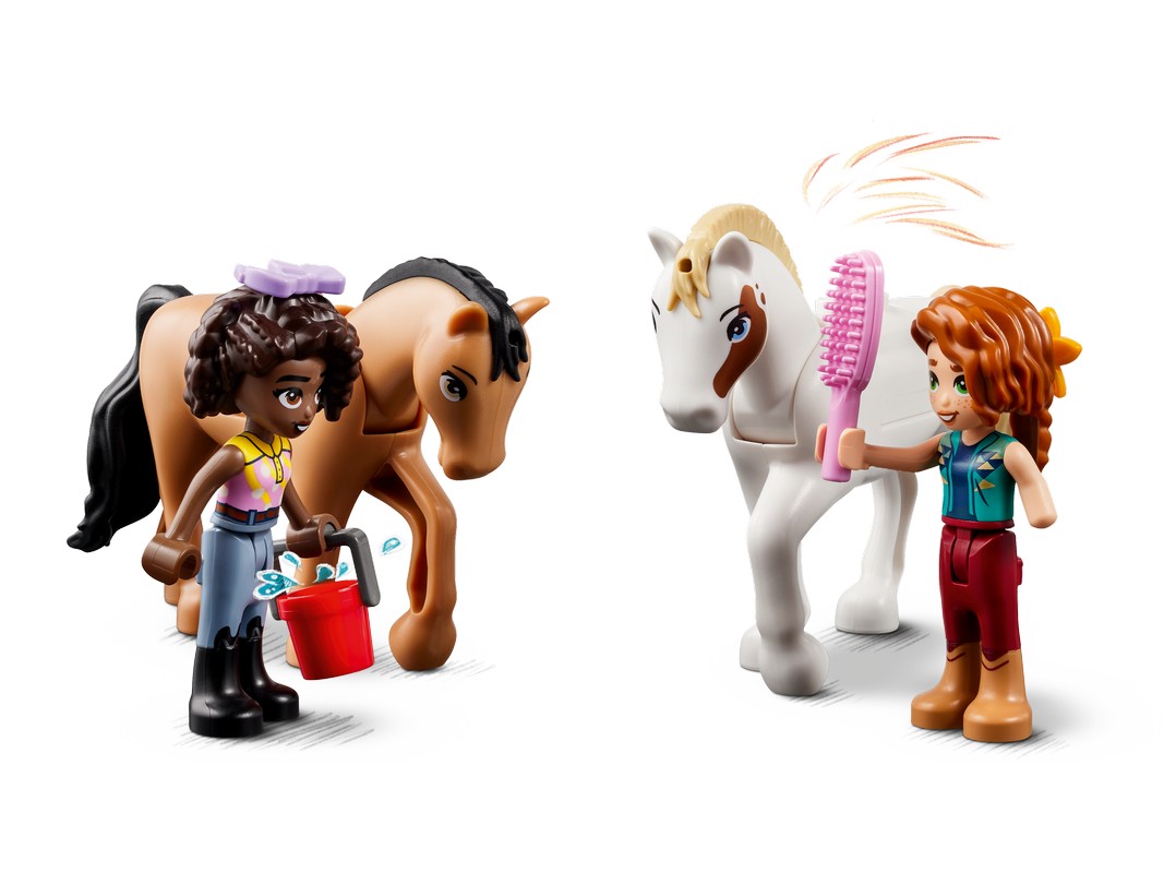 - 2 мини-куклы и аксессуары – В набор входят персонажи LEGO® Friends Отэм и Алия, а также 2 персонажа-лошади и множество аксессуаров для ухода за лошадьми
