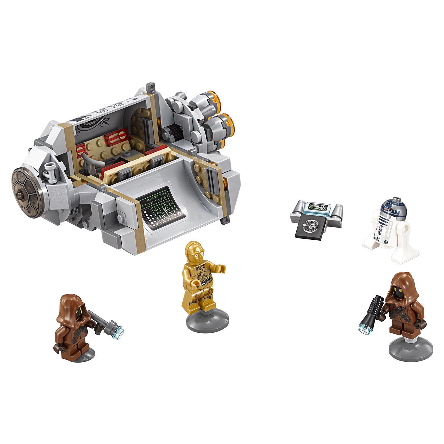 - 4 минифигурки (C-3PO, R2-D2 и 2 джавы).