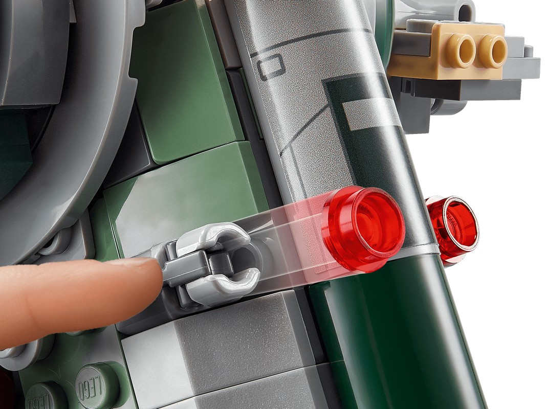 - В наборе есть две минифигурки LEGO: Боба Фетт с бластером и Мандалорец со своей бластерной винтовкой и копьем из бескара. Карбонитовый блок расширяет возможности творческой игры.
