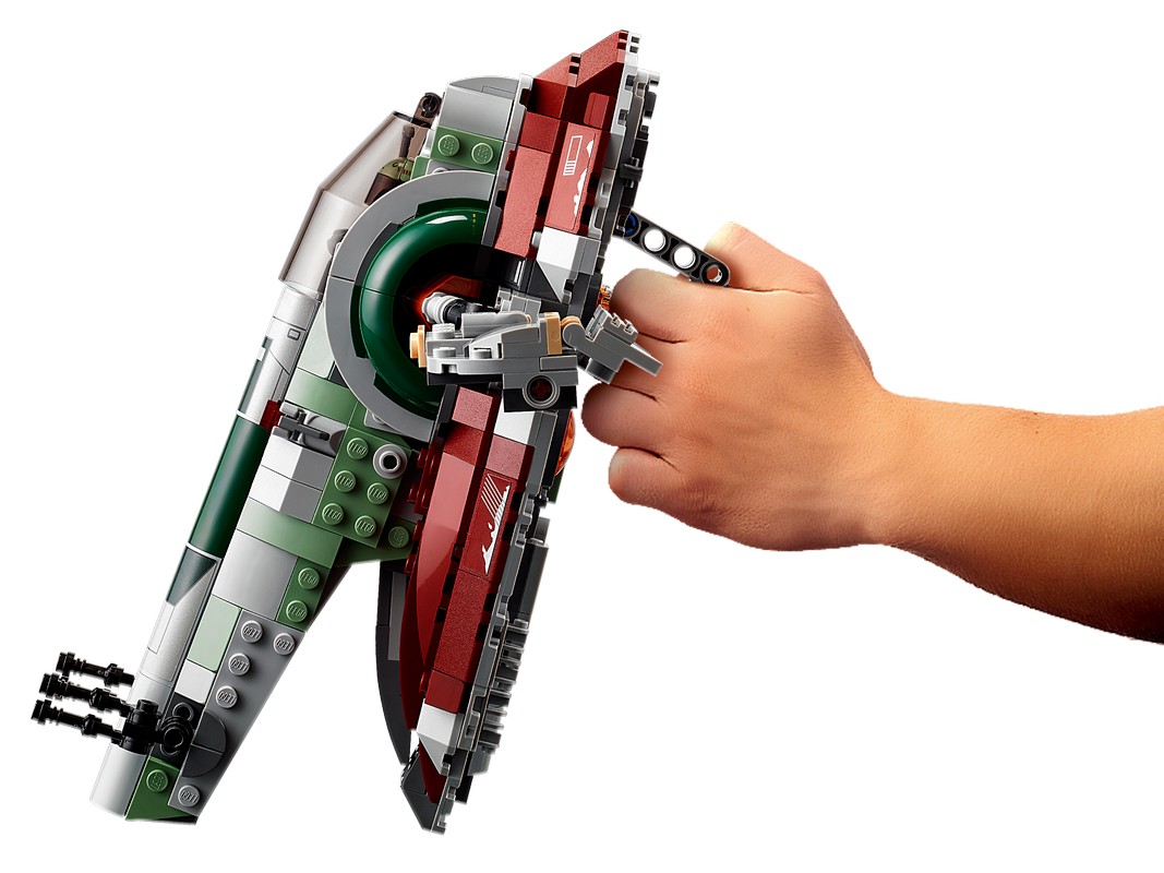 Поклонники сериала «Мандалорец» могут играть в охоту за головами и сражения с этой великолепной моделью звездолета Бобы Фетта (75312) из кубиков LEGO. У него есть ручка, чтобы было проще летать, открывающаяся кабина для минифигурки LEGO, поворачивающиеся крылья, два шипомета и два вращающихся спаренных бластера (не стреляющих). В премиальный набор также входят минифигурки LEGO Бобы Фетта и Мандалорца с оружием и карбонитовый блок, помещающийся в трюме звездолета.