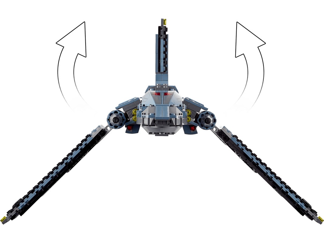 - Крылья у сборного шаттла поднимаются и опускаются, переключаясь между режимами посадки и полета. Он оснащен двумя пружинными шутерами, а киль сверху поднимается, открывая доступ к спаренной кабине для минифигурки LEGO и заднему отсеку.