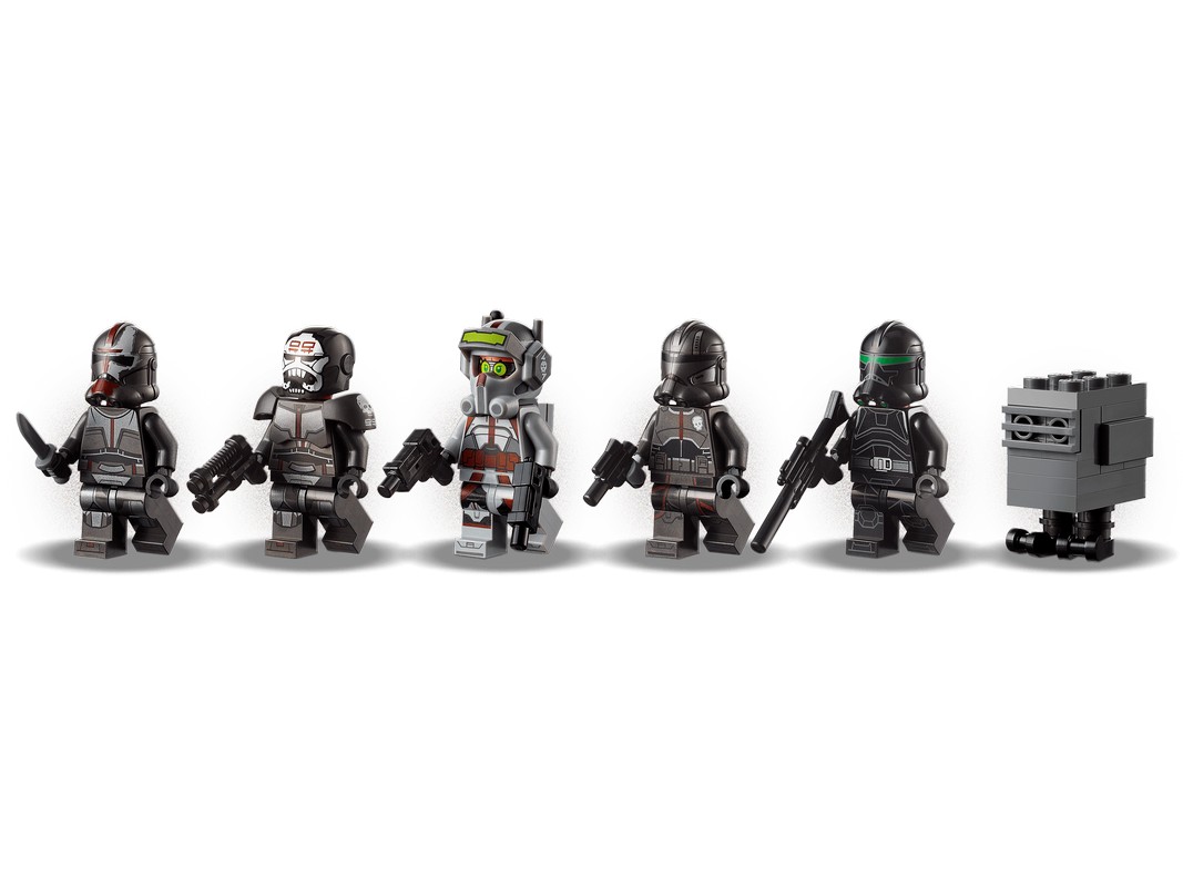 - Включает 5 минифигурок LEGO клонов Бракованной Партии: новинки августа 2021 года Тех, Эхо, Охотник, Крушила и Прицельщик. У них есть разное оружие, у Теха — его верный рюкзак, а также в набор входит фигурка дроида питания LEGO.