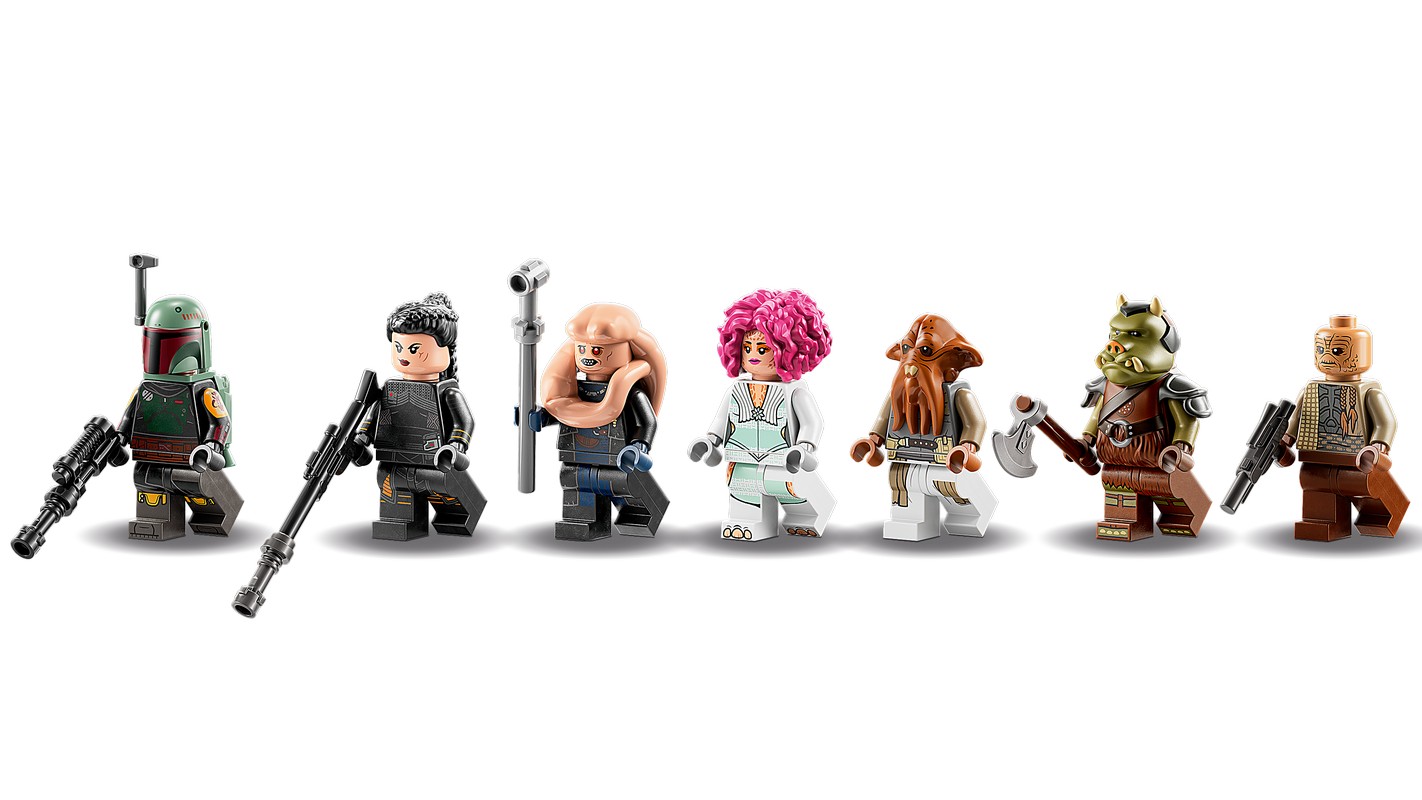 - Семь минифигурок LEGO® Star Wars™ для творческой ролевой игры — Боба Фетт и Феннек Шэнд, Биб Фортуна, танцовщица-тилинка, викуэй-охранник, гаморрский стражник и куаррен, а также разнообразное оружие