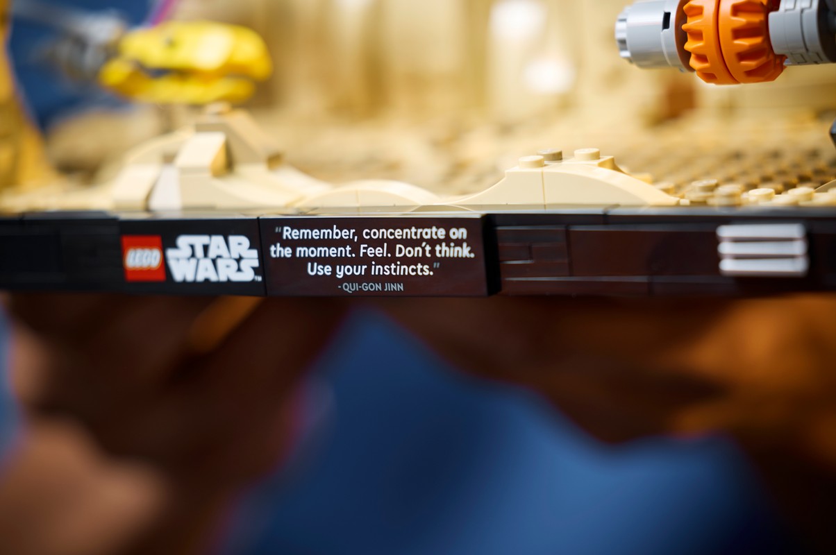 Впечатляющая конструкция-к модели and-display прилагается табличка с советом Куай-Гона Джинна (“Помни. Сосредоточьтесь на текущем моменте. Почувствуйте. Не думай. Доверяй своим инстинктам”) и кубик, изготовленный в честь 25-летия LEGO Star Wars.
