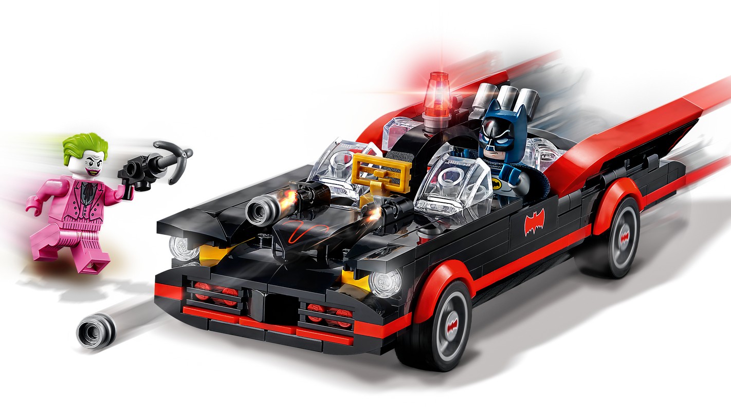В набор входит сборная модель Бэтмобиля, которую можно собрать с шипометами или без них, а также минифигурки Бэтмена и Джокера в классическом стиле 1960-х годов и вращающаяся подставка.
