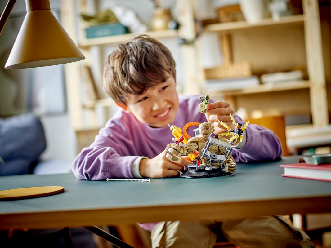 - Собираемая боевая игрушка LEGO® для детей – Юные поклонники Marvel могут повернуть суставчатого Песочного человека и использовать его огромные руки, чтобы схватить Человека-паука, когда он раскачивается над головой на своей гибкой паутинной "веревке"