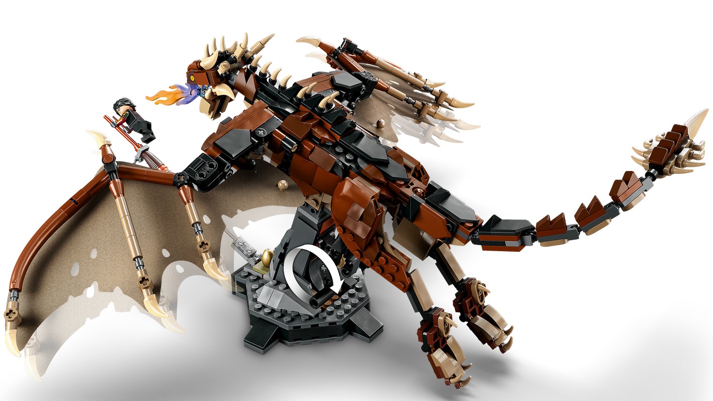 Эта собранная из кубиков модель воссоздает черную чешую, шипастый хвост и огненное дыхание венгерской рогатого хвоста. Это культовое существо не только интересно собирать, но и впечатляет — дети также могут управлять его реалистично сочлененными крыльями. Ручка сзади заставляет крылья изящно взмахивать вверх и вниз, демонстрируя полный размах крыльев зверя более 40 см (15 дюймов). Коллекционная фигурка стоит на прочной основе и сопровождается минифигуркой Гарри Поттера верхом на метле. Волшебство продолжается с бесплатным приложением «Инструкции по сборке LEGO», которое позволяет детям масштабировать и вращать модель во время сборки.