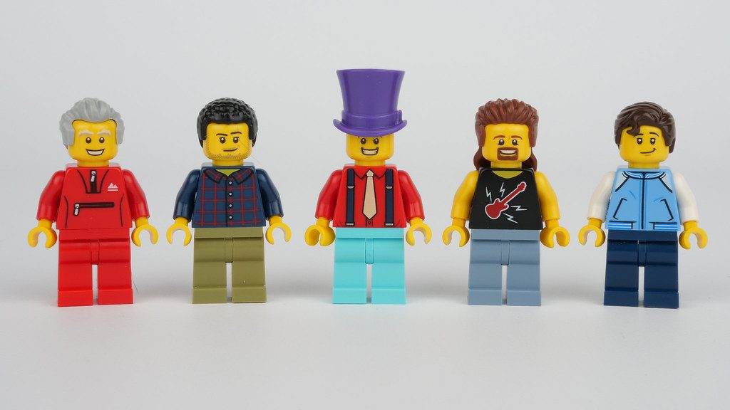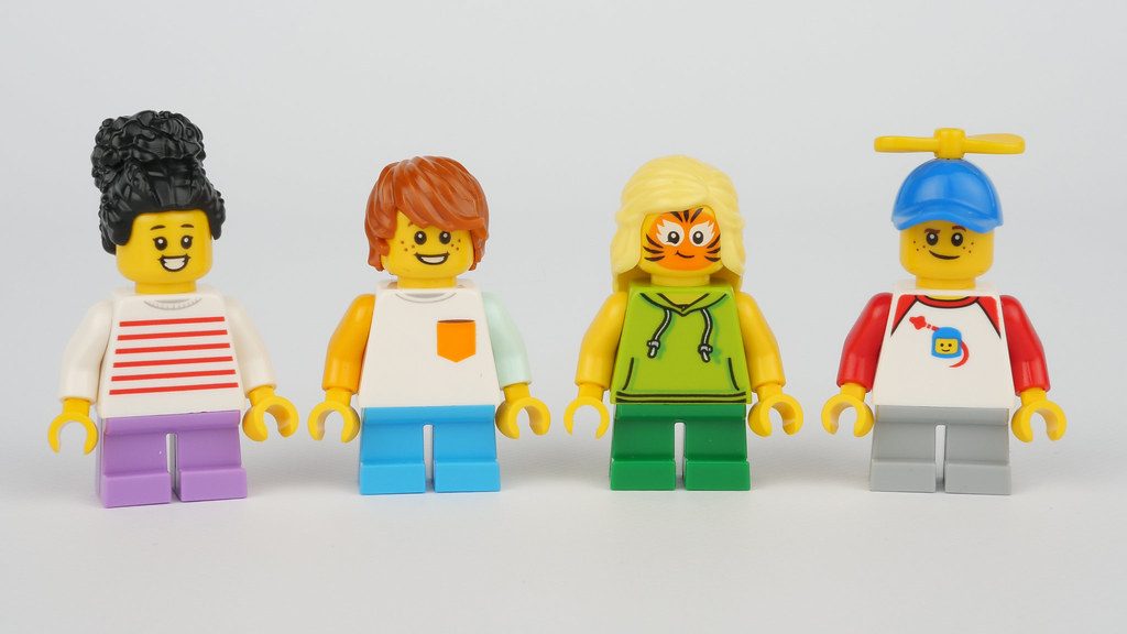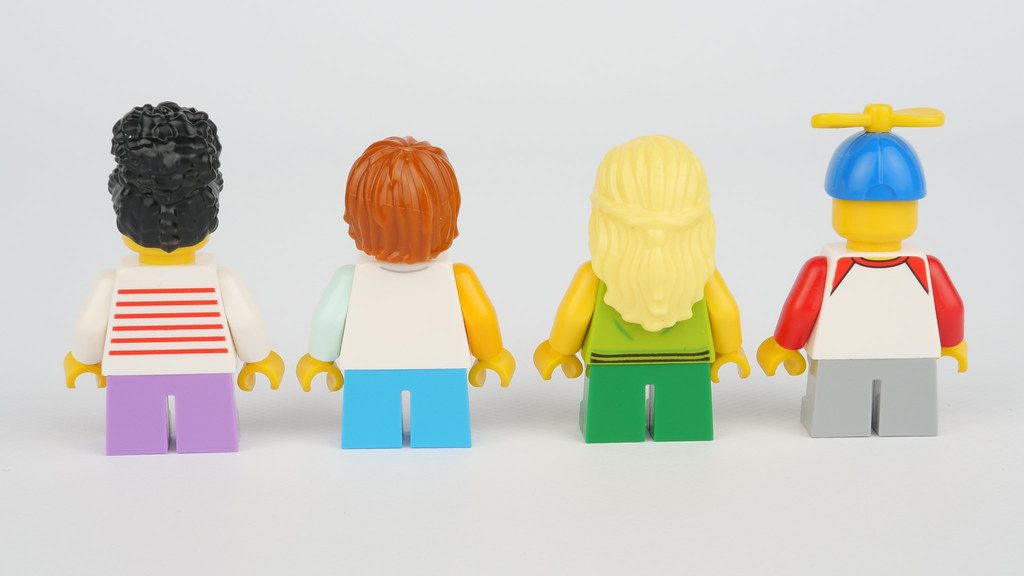 Набор содержит 14 минифигурок: 5 взрослых женщин, 5 взрослых мужчин и 4 детей. Я укзал ниже, если у них есть новые (или недавно представленные) торсы и волосы, просто над фотографиями минифигурок.