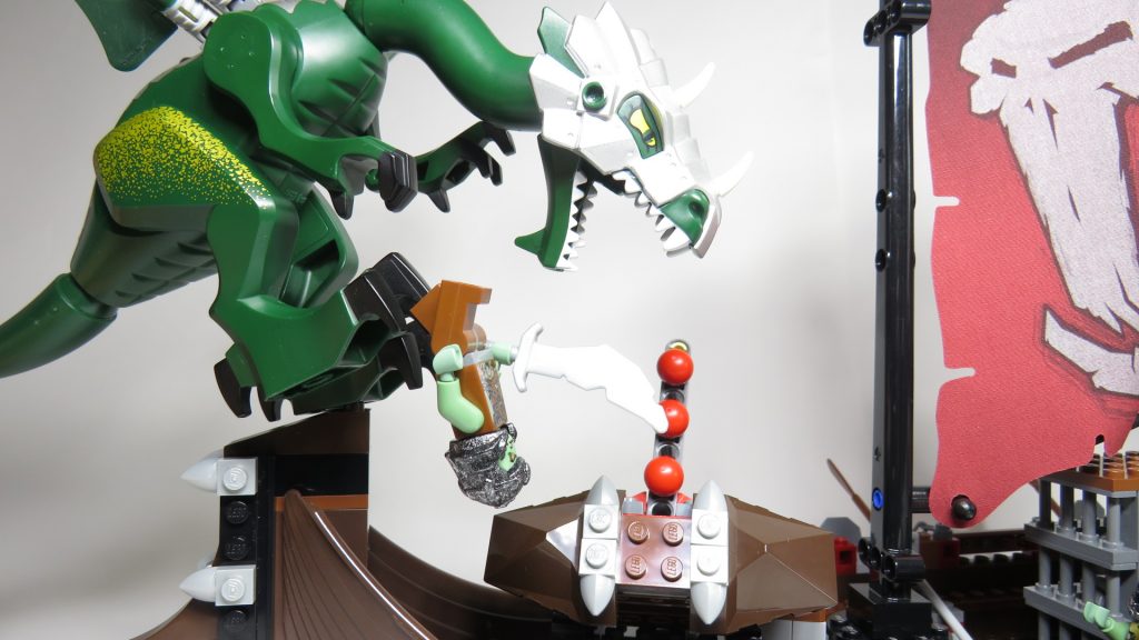 При этом дракон очень устойчив и сбалансирован. Дракон темно-зеленого цвета с золотисным напылением, и серебристой броней на спине, в области посадки наездника, и на голове в виде несъемного шлема. Пасть дракона так же открывается, позволяя установить туда элемент пламени, либо просто покормить дракона. Если же лишить дракона крыльев, он сойдет за динозавра. К слову, драконов такого типа было выпущено 4 штуки, два красных, один черный и один зеленый. Стоимость одного дракона по bricklink.com составляет от 2500 рублей, и нужно учесть что это цена дракона бывшего в употреблении.